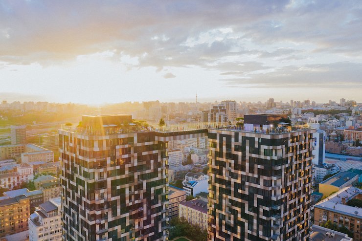 ЖК Tetris Hall від A.Pashenko Architects. Комплекс включає два 25-поверхові будинки, сполучені мостом на рівні даху. Над зеленою зоною працювала студія ландшафтної архітектури Kotsiuba.