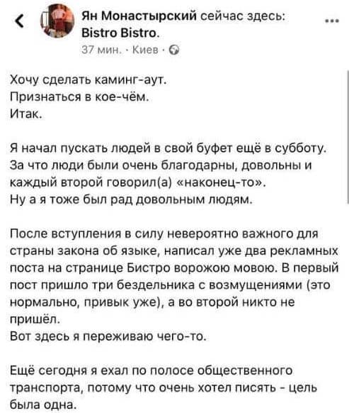 Хвиля негативних коментарів і низькі оцінки закладу почалися після посту, в якому Ян Монастирський зізнався, що пускав відвідувачів під час січневого карантину, а також написав два рекламних поста «ворожою мовою». Власник Bistro Bistro повідомив, що його називали українофобом і бажали смерті.