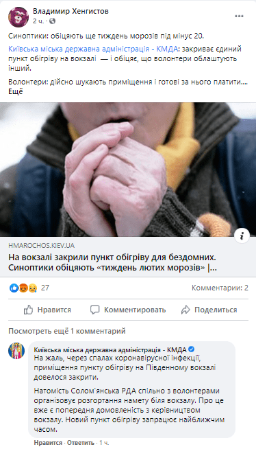 У Києві на Південному вокзалі закрили цілодобовий муніципальний пункт обігріву. У КМДА пояснюють, що це через спалах коронавірусу. За словами волонтера руху «Молодь за мир» Євгена Савватєєва, це приміщення вже зачинене щонайменше кілька днів — попри сильні морози у місті.