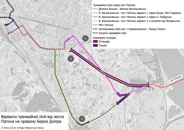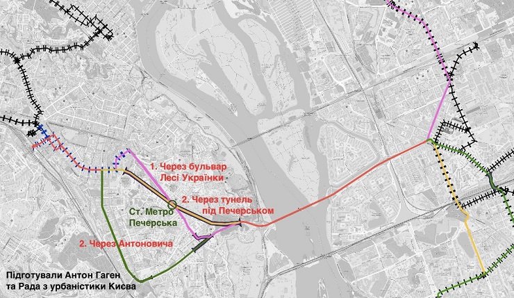 Активісти розробили найбільш вірогідні маршрути трамвая, який через міст Патона об’єднає два береги Дніпра у Києві. Про це повідомив голова громадської організації «Рада з урбаністики Києва» Віталій Селик.
