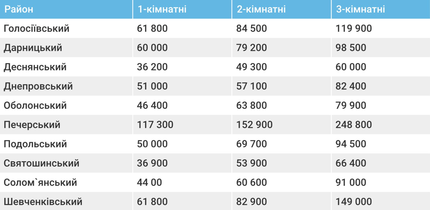 Вартість житла істотно відрізняється залежно від району столиці. За ціною однокімнатної квартири на Печерську можна придбати три таких самих квартири в Деснянському або Святошинському районах. У самому Києві квартири практично вдвічі дорожчі, ніж у інших великих містах України.