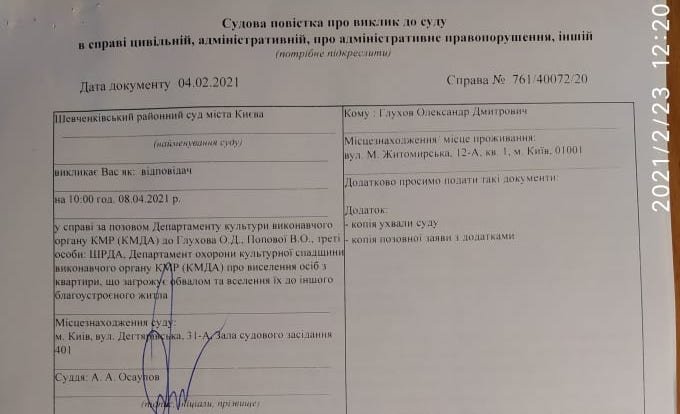 Департамент культури КМДА подав позов до суду про виселення Олександра Глухова, єдиного мешканця аварійної садиби Мурашка на Малій Житомирській, 12-А. Фото повістки опублікувала активістка Юлія Нікітіна.