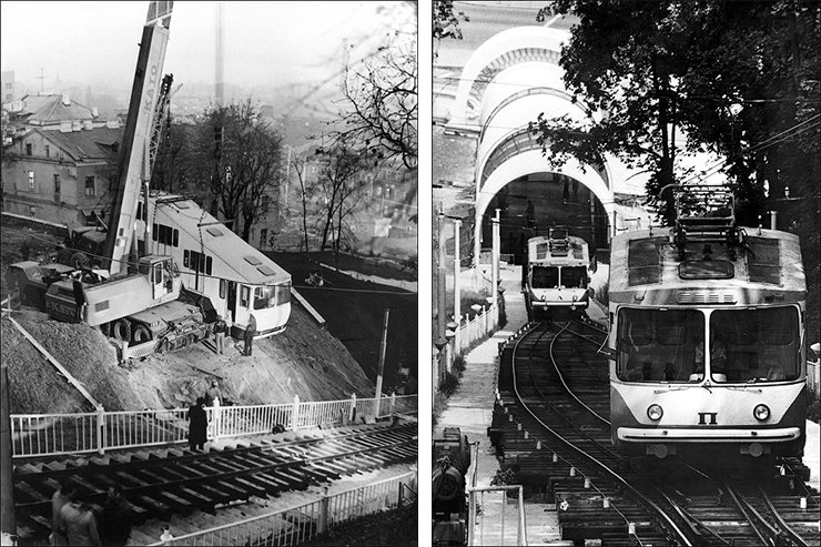 Ліворуч – новий вагон К-80 ставлять на рейки, 1984 рік. Фото з блогу Олега Тоцького, tov-tob.livejournal.com
