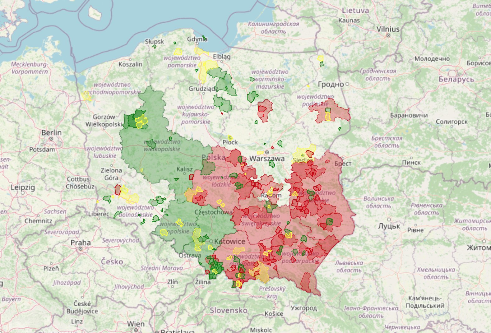 Червоним позначено польські території, які проголосили себе «вільними від ЛГБТ». Мапа: atlasnienawisci.pl