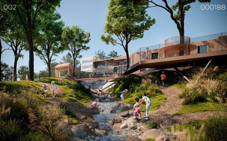 «Перш за все ми хотіли зберегти характер середовища і надати дітям можливість взаємодіяти з природою, тому будівлі посаджені на ділянку так, щоб навчальні приміщення були орієнтовані на рекреаційні території довкола, а на самій ділянці організовані елементи, що спонукають дітей досліджувати оточення. Ми врахували контекст середовища, намагались максимально використати наявний рельєф. Форми будівель реагують на існуючу забудову та враховують майбутній розвиток територій довкола», – розповідають про проєктні рішення архітектори.