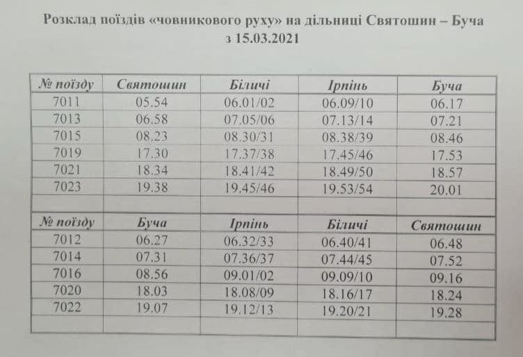 Перший поїзд рушатиме зі станції Святошин о 05:54 та прибуватиме до Бучі о 06:17. Наступні рейси курсуватимуть зі Святошина о 06:58, 08:23, 17:30, 18:34 та 19:38. У зворотному напрямку електричка відправлятиметься з Бучі о 06:27, 07:31, 08:56, 18:03 та 19:07.