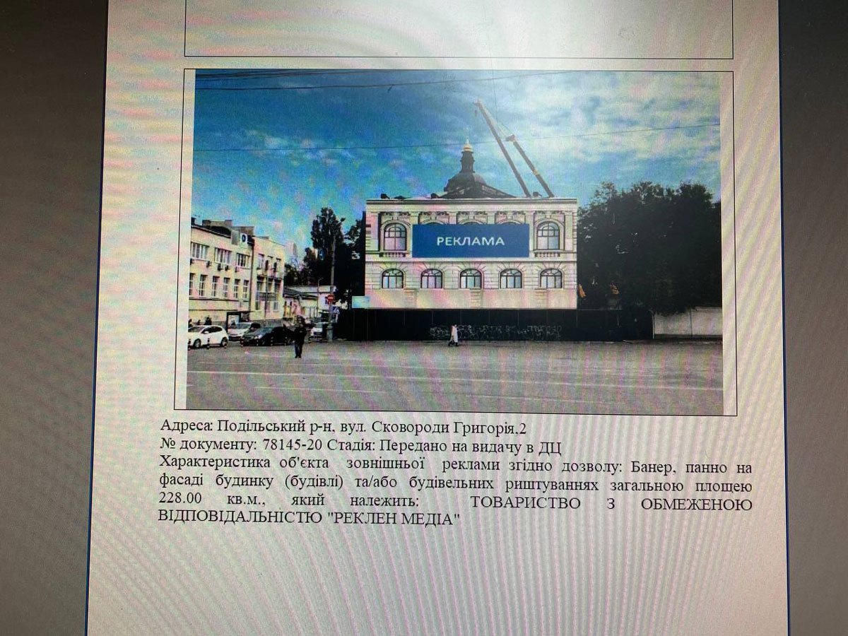 Проте фасади Контрактової площі знаходяться у нульовій форматній зоні, згідно з Порядком розміщення реклами в м. Києві, тому площа рекламного повідомлення має становити не більше 20% від загальної площі риштування фасаду. Більше того, власник рекламної конструкції під час подачі документів на дозвіл надав проєкт конструкції із зовсім іншою площею рекламного зображення.