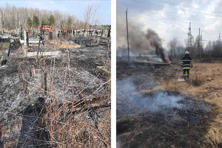 Ліворуч – вигоріла трава на кладовищі у Віті-Поштовій. Фото: ДСНС