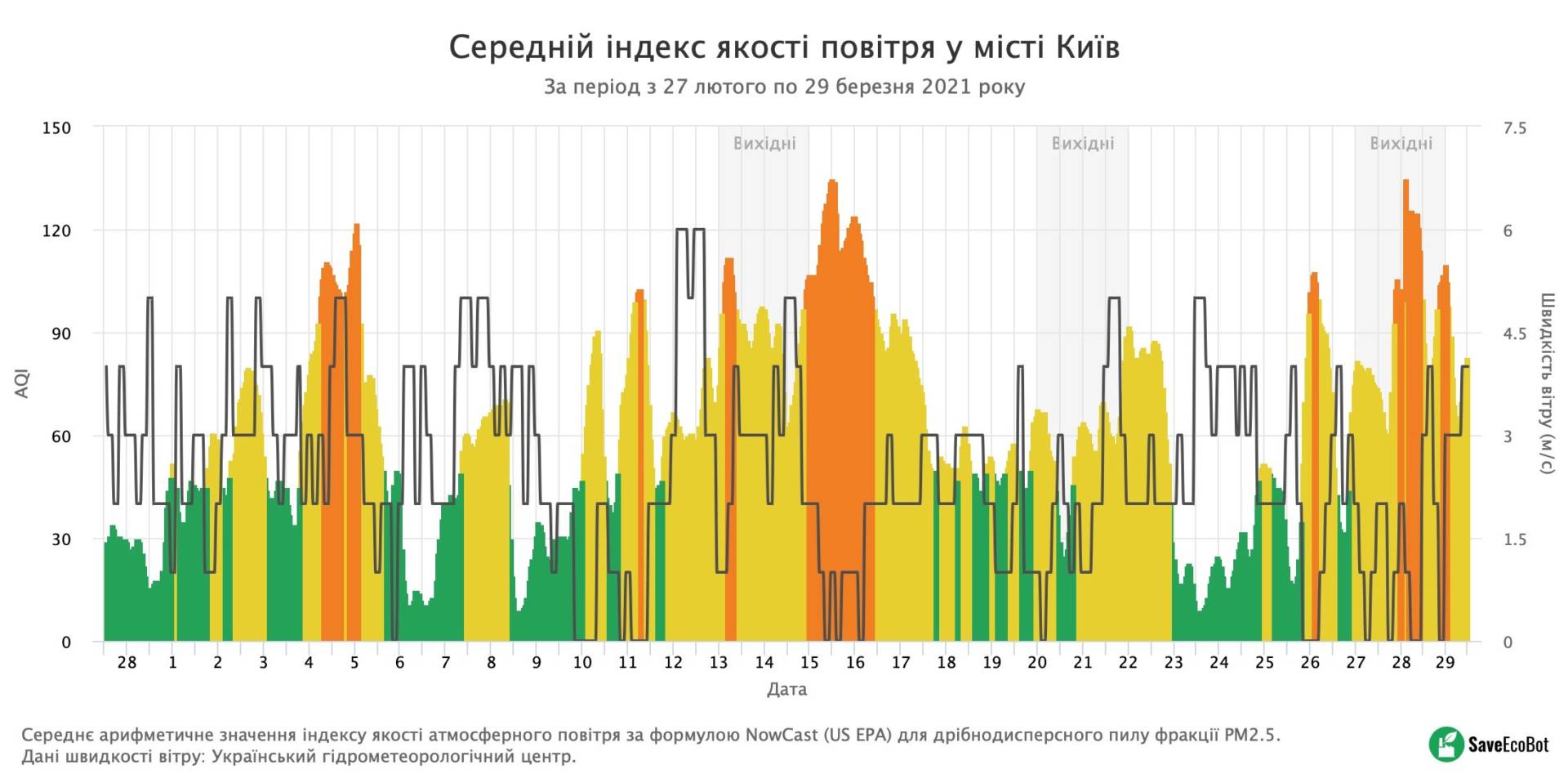Після кількох днів незвично чистого повітря, що спостерігалися в Києві 23-25 березня, рівень забрудненості знову значно зріс. Зокрема, пік спостерігався у неділю, 28 березня. Зараз сервіси IQAir, SaveEcoBot та LUN Місто Air фіксують також високий рівень забруднення.