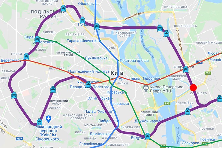 Червоним колом позначено станцію «Київська Русанівка» на схемі міської електрички