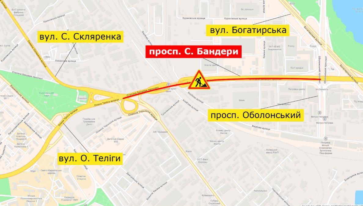Також 10 квітня почнеться капремонт на на проспекті Степана Бандери, який триватиме до 28 квітня. Протягом цього часу зніматимуть дорожнє покриття між Оболонським проспектом і станцією «Зеніт».