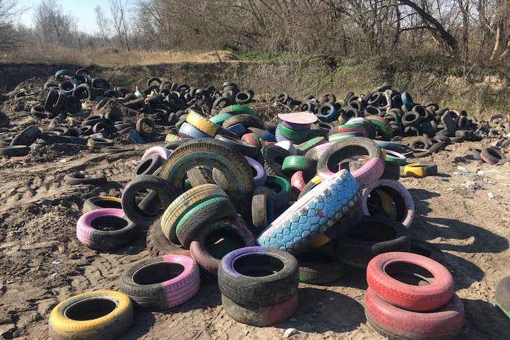 У той час як у Києві масово прибирають вживані автомобільні покришки з подвір’їв, містяни почали звертати увагу на звалища покришок на околицях столиці, переважно на лівому березі. Підозрюють, що це той самий «декор», який вивозять комунальники, адже шини розмальовані.