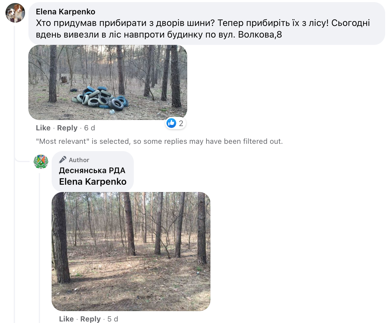 У Деснянській райадміністрації у відповідь на закид щодо звалища шин у лісі біля вулиці Космонавта Волкова показали фото цього місця, вже прибраного.