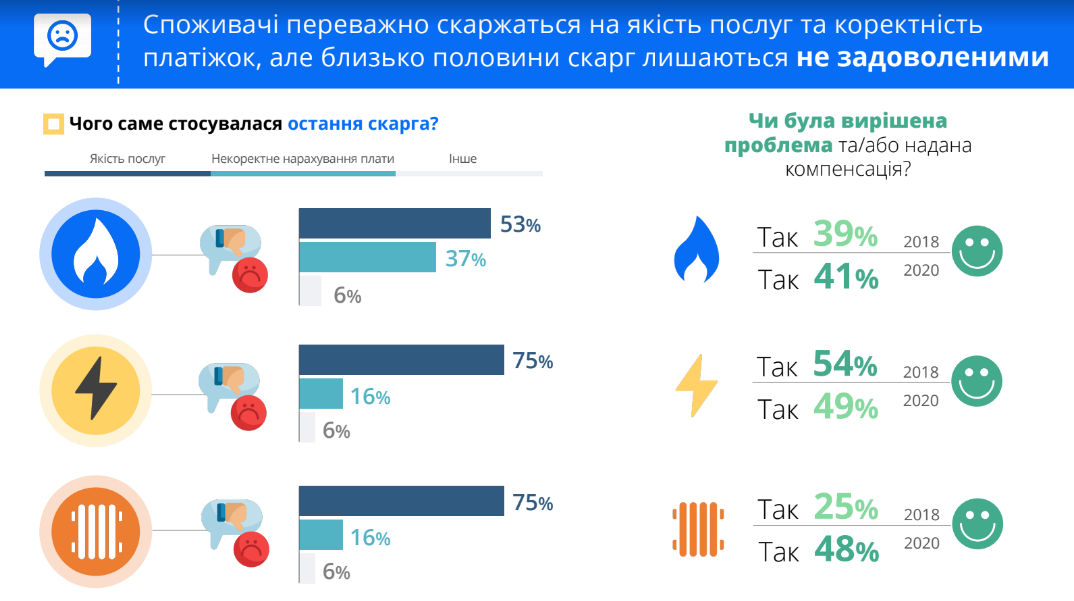Найчастіша причина скарг споживачів – низька якість послуг (75%). Більше половини скарг спрямовуються до компаній-постачальників. Кожна четверта надходить до місцевих органів влади або керуючих компаній. Однак менше половини скарг стосовно послуг з газопостачання, електропостачання і централізованого теплопостачання були вирішені на користь споживачів.
