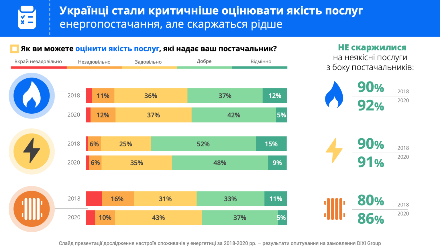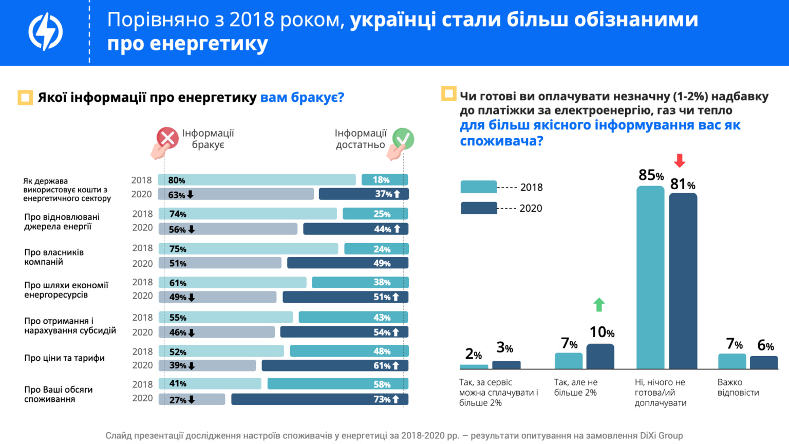 У рамках проєкту USAID «Прозорість Енергетичного Сектору» на замовлення аналітичного центру DiXi Group, соціологи наприкінці 2020 року провели дослідження, дані якого порівнювалися із результатами аналогічного опитування дворічної давнини. Це дозволило оцінити рівень поінформованості споживачів та рівень задоволення енергетичними послугами в динаміці.