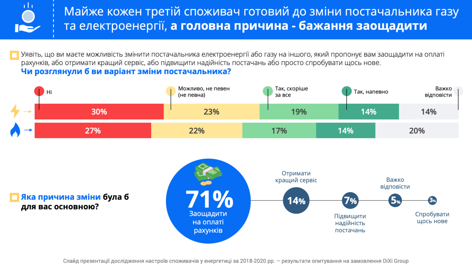 Минулого року для споживачів вперше стало можливо змінити компанію-постачальника енергетичних послуг, зокрема, на ринку природного газу. Про готовність до зміни постачальника електроенергії або газу заявляє приблизно кожен третій опитаний. Основна причина – бажання заощадити на оплаті рахунків (71%). При цьому кияни готові до змін менше за респондентів з інших регіонів України.