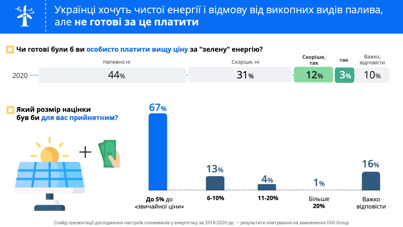 «Подібне опитування європейців у 2019 році показало, що їхня готовність платити більше за «зелену» енергію у два з половиною рази перевищує показник українців, – зазначив експерт DiXi Group Богдан Серебренніков. – Тому велике завдання, передусім для уряду, правильно інформувати споживачів щодо розвитку цієї сфери. Щоб вони асоціювали зелену енергетику не лише з вищою ціною, але й з іншими перевагами, які вона може надати»