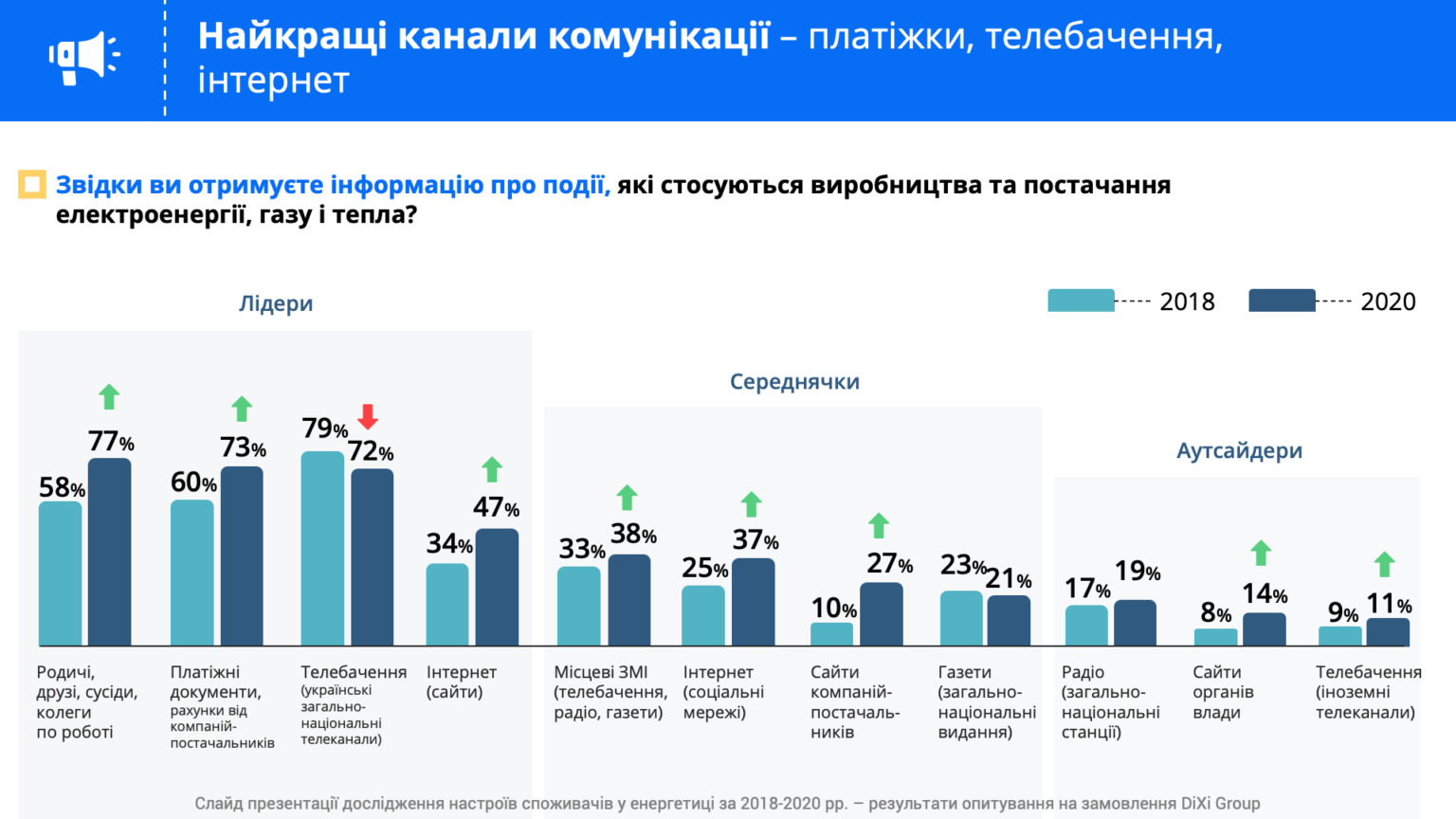 Українці переважно отримують інформацію про енергопостачання від родичів, друзів, сусідів (77%). На другому місці – платіжні документи від постачальників (73%). Популярність цих джерел інформації зростає, натомість телебачення дещо втрачає вплив: з 79% у 2018 році до 72% у 2020-му.