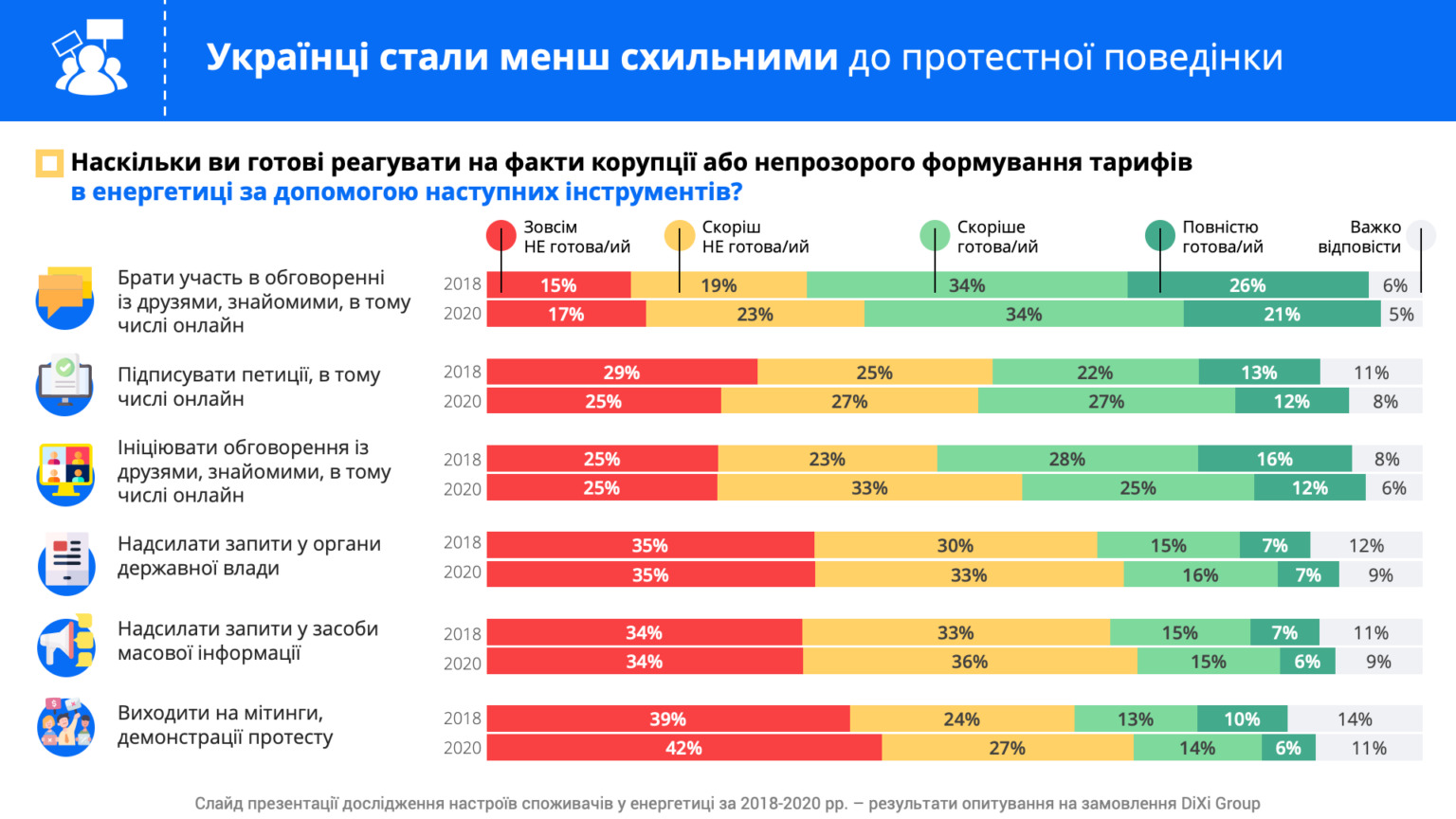 Як українці готові реагувати на факти корупції або непрозорого формування тарифів в енергетиці? Найбільша частка респондентів готові брати участь в обговоренні із друзями, знайомими (55%). Варто зазначити, що частка громадян, які допускають можливість виходу на мітинги, демонстрації протесту знизилася із 23% до 19%, а про неготовність до активних протестів повідомляють 69% (у порівнянні з 63% у 2018 році).