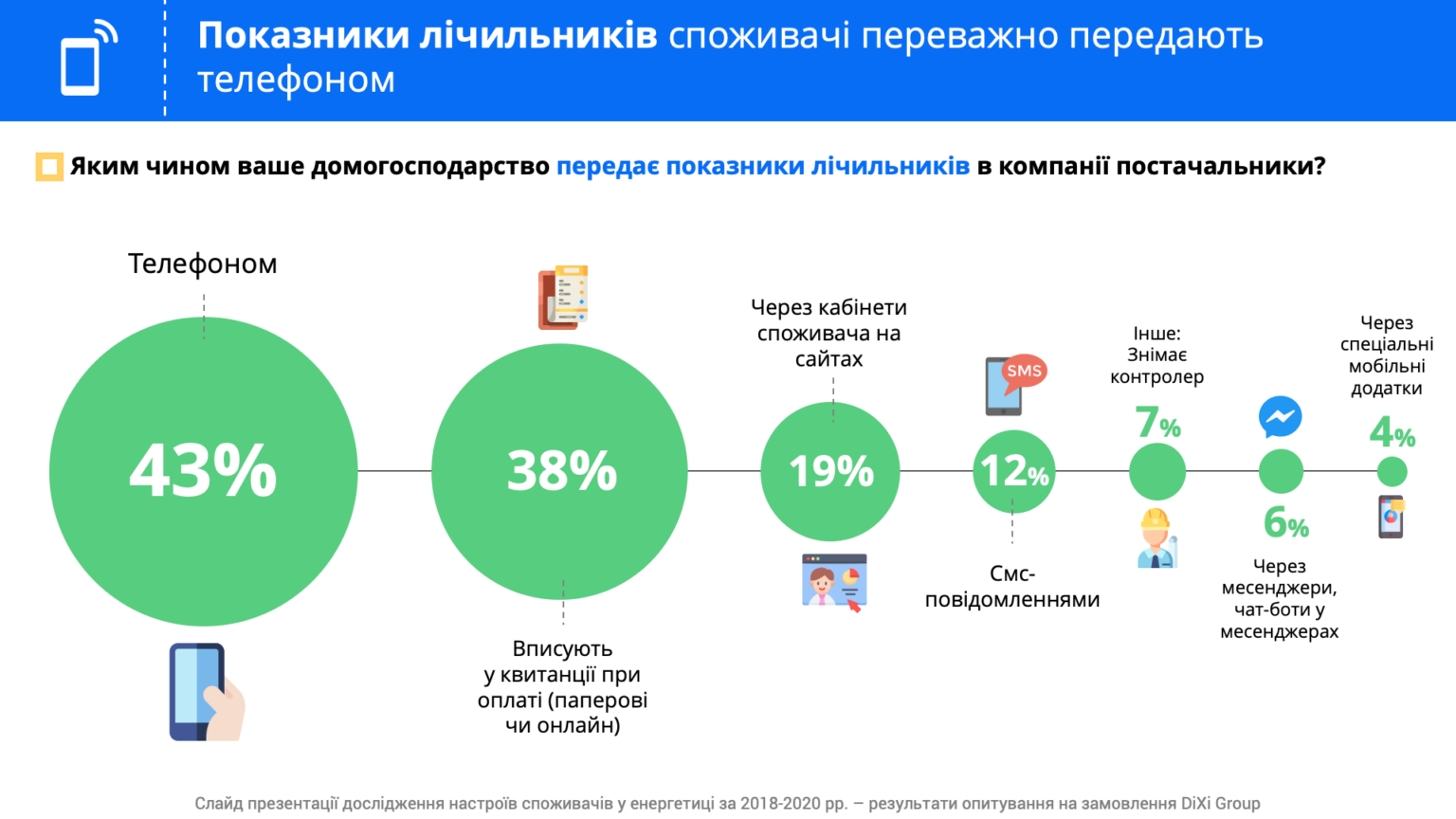 Майже кожне друге домогосподарство передає показники лічильників телефоном (43%). На другому місці – заповнення квитанцій (паперових чи онлайн) (38%); на третьому – електронні кабінети споживачів (19%).