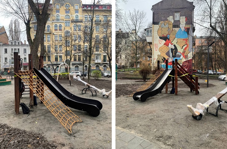 У сквері Київських інтелігентів на розі вулиць Олеся Гончара та Велика Житомирська відновили старий дитячий майданчик. Проєкт втілило ТОВ «ТИ».