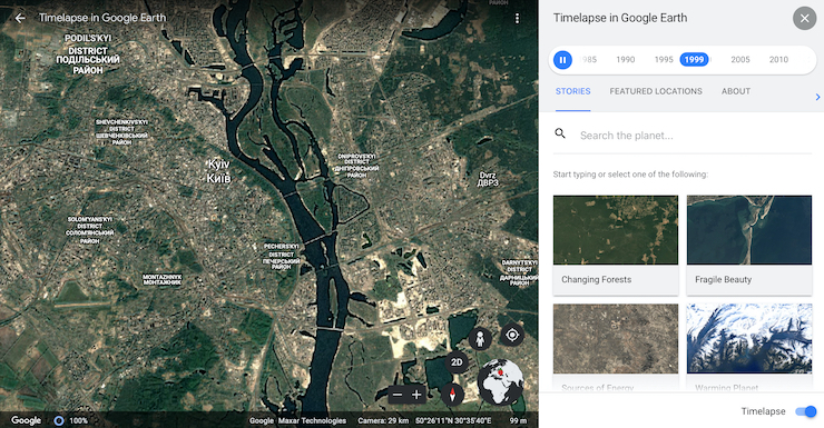 Скріншот Google Timelapse: Київ. Праворуч внизу – віртуальні тури