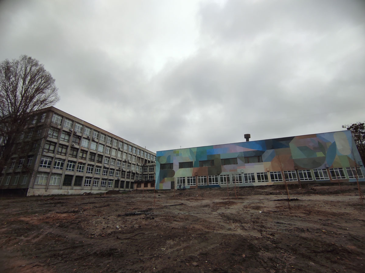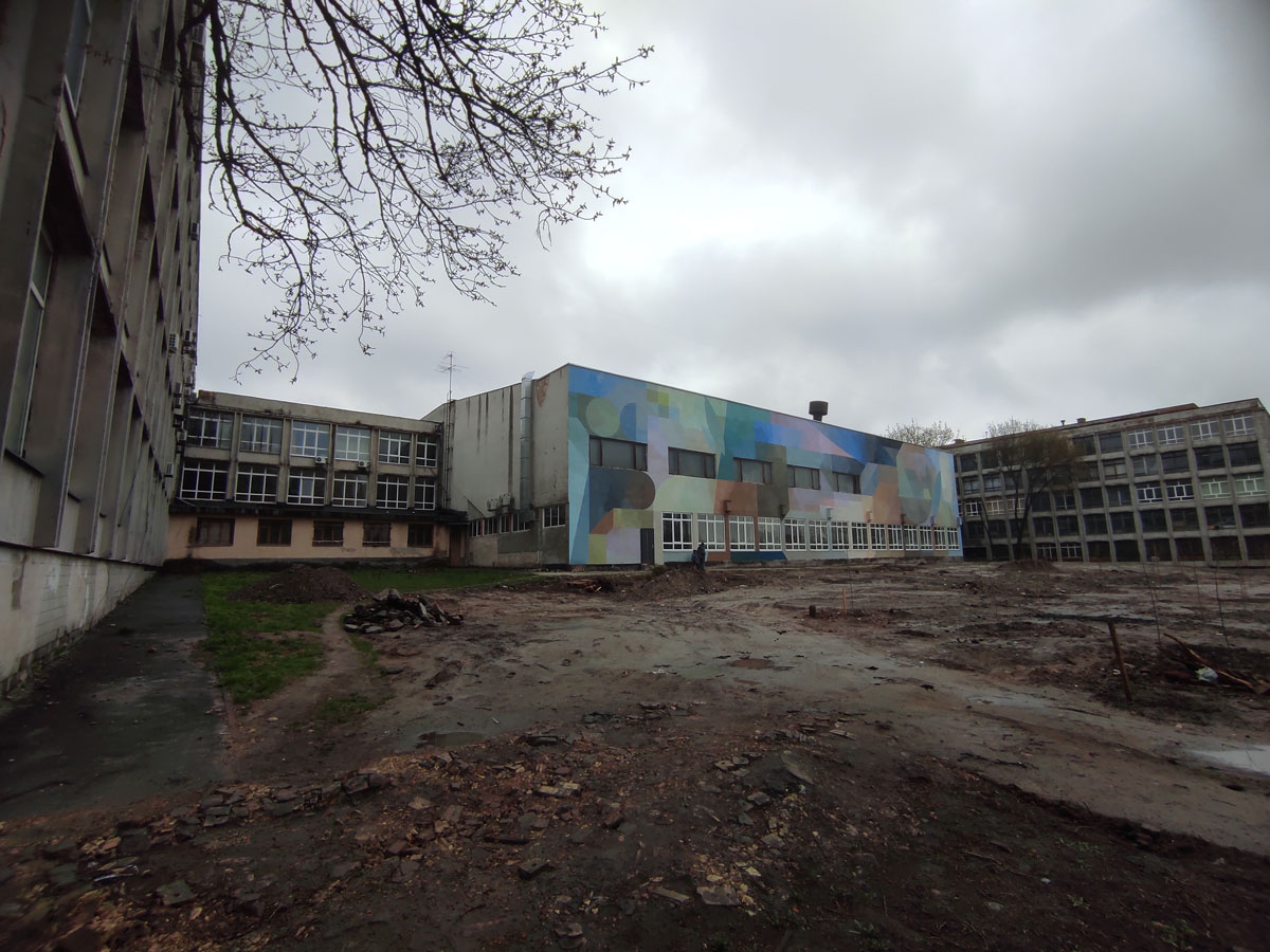 Адміністрація також заявляла про наміри утеплити задній фасад корпусу перед створенням муралу. Втім, щось пішло не так – і стінопис намалювали просто поверх тинькування, унеможлививши подальші дії з підвищення енергоефективності. При цьому в ході робіт перший поверх корпусу вратив характерне заглиблення. Форму і площу скління дещо змінили, а стіну зробили суцільною.