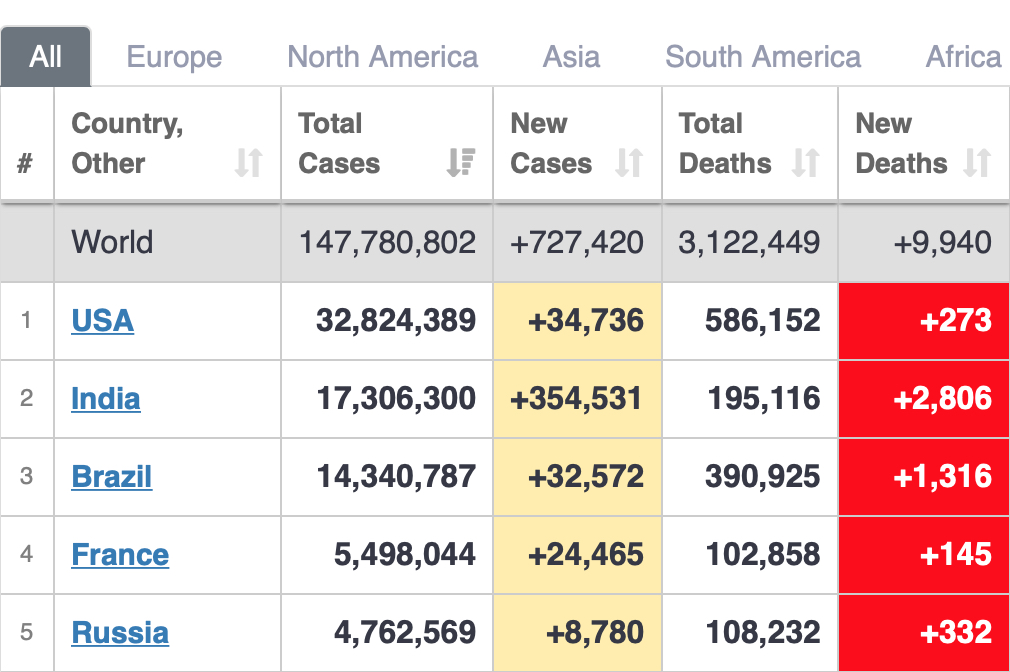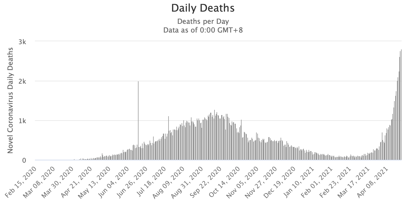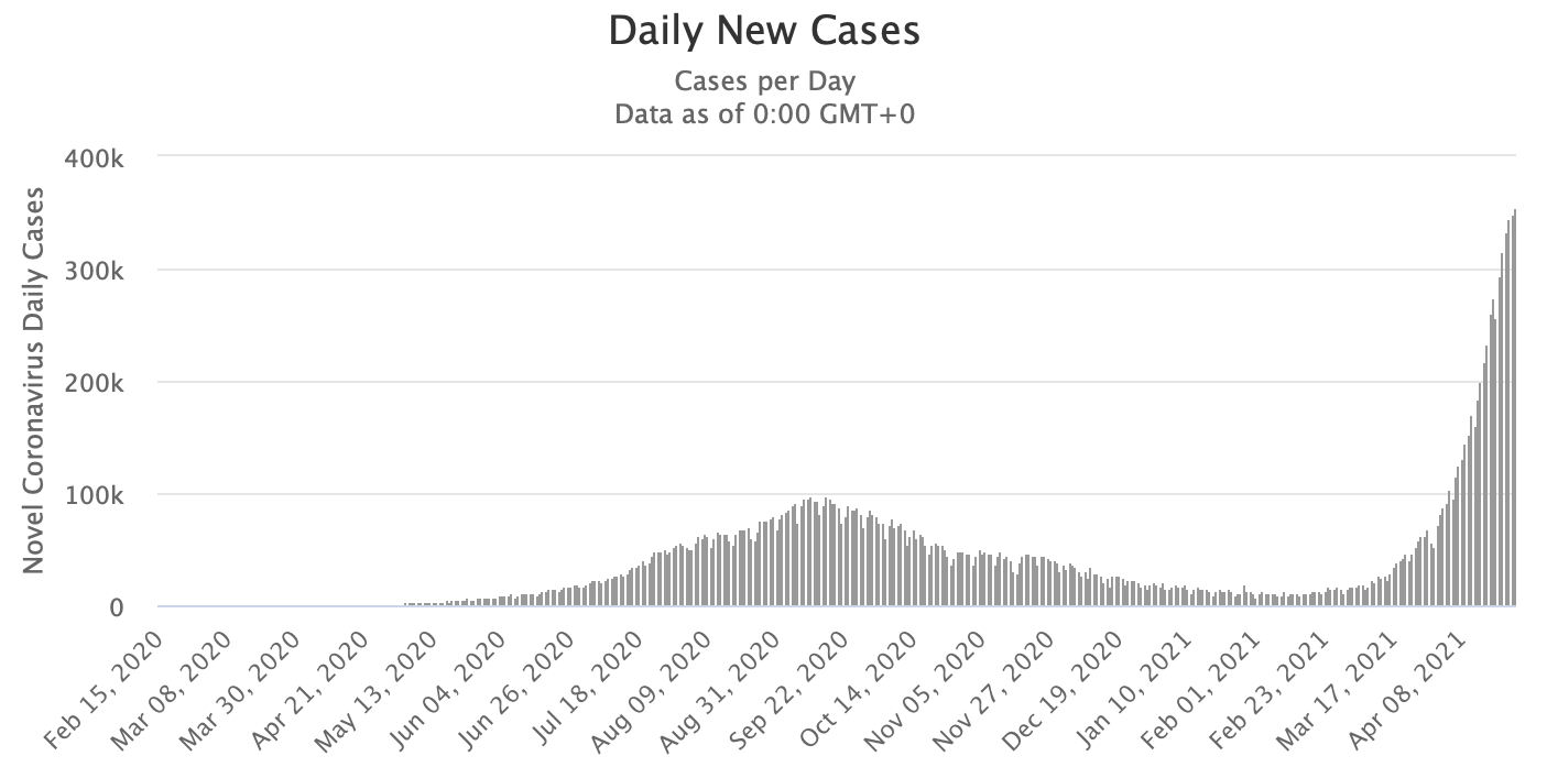 Так, за минулу добу в країні підтвердили понад 350 тисяч нових випадків, а кількість померлих за день перевищує 2,8 тисячі. За час пандемії в Індії вже загинуло від коронавірусу понад 195 тисяч людей. Графіки worldometers.info показують, що потужний стрибок захворюваності і смертності почався у перших числах квітня.