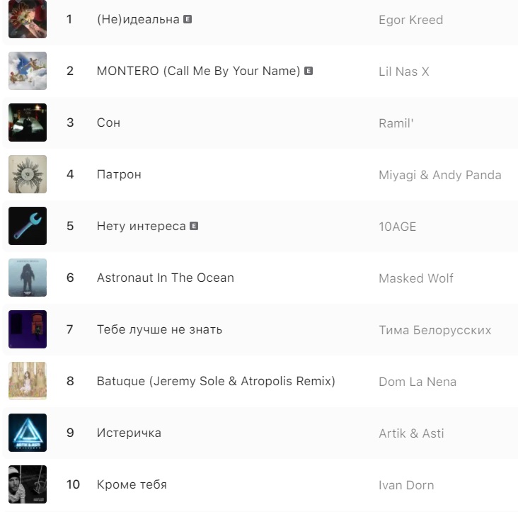 Більшість виконавців у рейтингу – російські. Серед українських артистів – Іван Дорн, Лобода, Artik Asti, Макс Барських. Жителі Києва, судячи з рейтингу Apple Music, слухають переважно реп.
