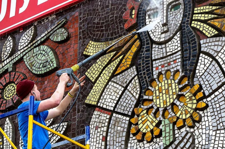 Учасники ініціативи «Києве, мий» разом із місцевими жителями відмили мозаїку на спортивному клубі «Рубін», що на вулиці Івана Миколайчука, 11.