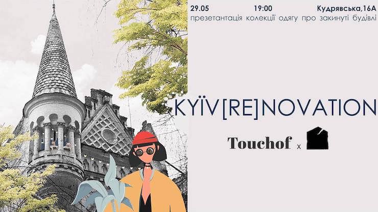 Touchof – український бренд вуличного одягу, який шиє міські колекції та присвячує їх певному місту – Києву, Токіо, Берліну тощо. Лімітовану колекцію kyїv[re]novation презентують у дворику закинутої поліклініки Спілки письменників України.