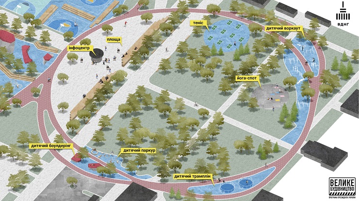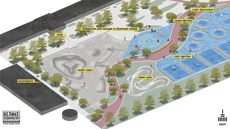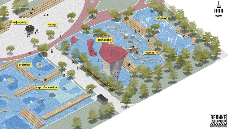 Там створять скейт-парк, майданчики для вуличних видів футболу, баскетболу, танців, воркауту й паркуру, клаймбінгу, облаштують дитячі урбан-локації та столи для тенісу.