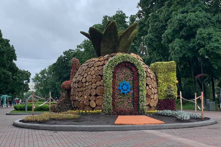 На головній алеї парку розмістили центральну композицію 2,5 метра заввишки – хатинку Ананас з дерев’яних кругляшів. Тут встановили фігури Губки Боба та його друга Патріка.