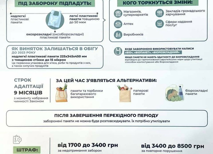 Розповсюдження пластикових пакетів каратиметься штрафом від 1700 до 3400 гривень. За повторне порушення – від 3400 до 8500 гривень. Пакети, які не відповідатимуть вимогам, будуть утилізуватись суб’єктами господарювання, які їх придбали.