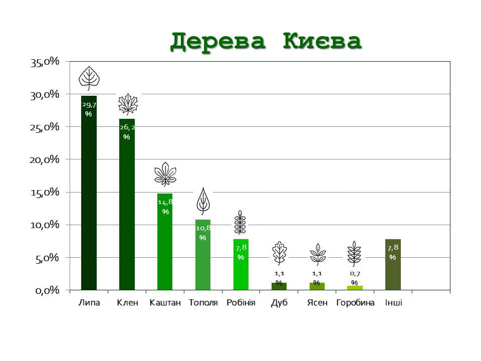 За даними, які оприлюднив керівник «Київзеленбуду» Олексій Король, кожне третє дерево в Києва – це липа. Приблизно така ж кількість кленів. При цьому, за словами Короля, з 2005 року кількість лип зменшилася, а кленів стало втричі більше.