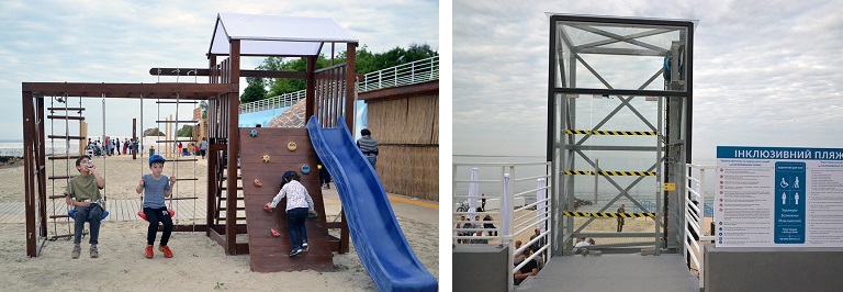 Пляж обладнаний спеціальним ліфтом, пандусами для спуску на пляж, тактильною плиткою, трьома видами вуличних меблів та пандусами для спуску у воду. Крім того, там є електромобілі для транспортування відвідувачів.