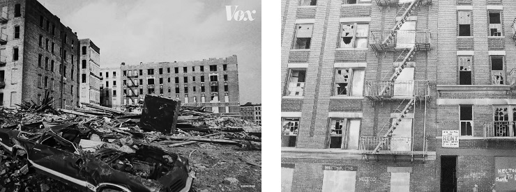 Медіа Vox розповідає, що подібні рецепти насправді не є новими. У Нью-Йорку в 1960-70-х роках, коли місто переживало економічну кризу та частковий занепад, люди виїжджали з міста – будинки були закинуті або в аварійному стані. У результаті місто заполонили тисячі пустих та занедбаних ділянок.