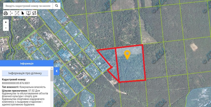 Земля, про яку йде мова, поділена на дві ділянки (21.96 гектара і 6.62 гектара) і знаходяться вони в комунальній власності міста Києва. Вони впритул прилягають до території Міжнародної тенісної академії. Цільове призначення вказано: для будівництва та обслуговування об’єктів фізичної культури і спорту – спортивно-оздоровчого комплексу з льодовим стадіоном і адміністративною будівлею. Станом на 2017 рік, дві земельні ділянки були здані в оренду ТОВ «Хокейний клуб «Сокіл Київ». Термін оренди землі був розрахований до 2 липня 2023 року.