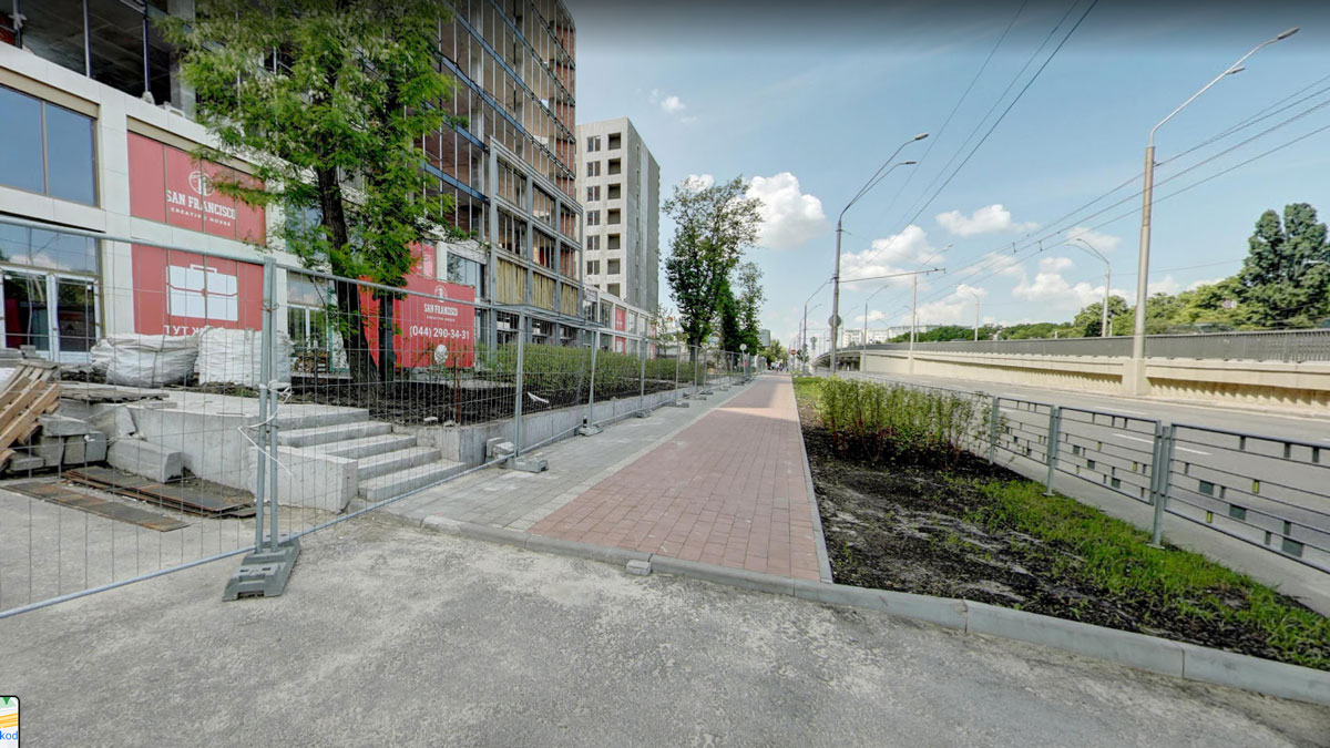 У 2018 році ділянка тротуару тут була ширшою, але вже у 2019 році її звузили за рахунок благоустрою й озеленення перед житловим комплексом. Паркомісця облаштовані за рахунок зеленої зони, що відділяла проїжджу частину від велодоріжки.