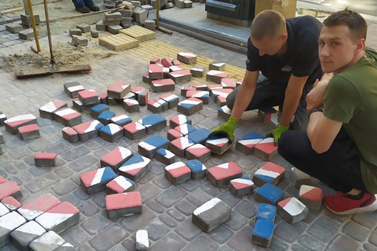 Комунальники намагались зібрати пазл із плитки з намальованим дорожнім знаком.