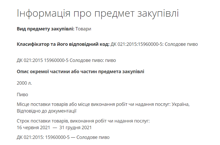 У Харківській області комунальне підприємство уклало контракт на закупівлю двох тисяч літрів пива. Відповідну інформацію на платформі Prozorro розмістило комунальне виробничо-експлуатаційне підприємство «Держпром».