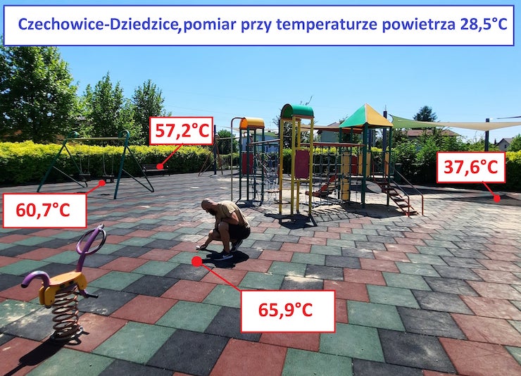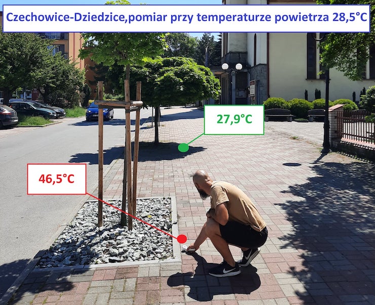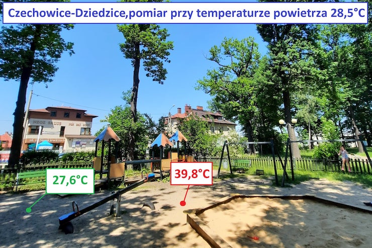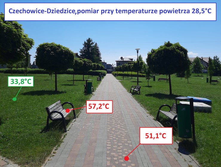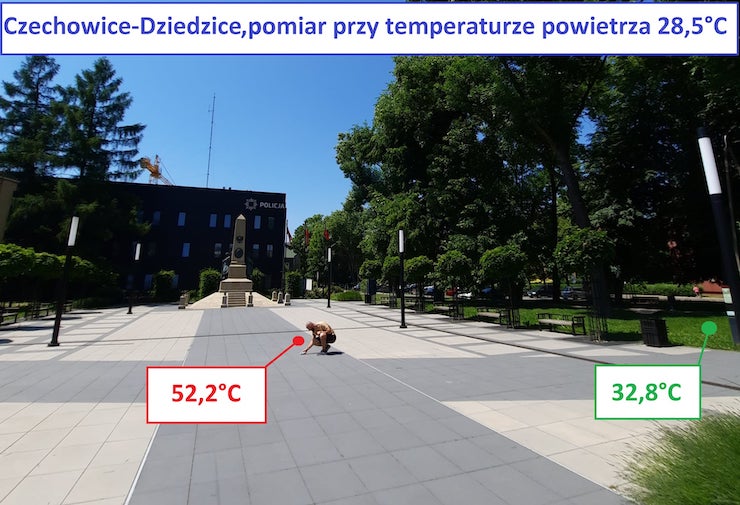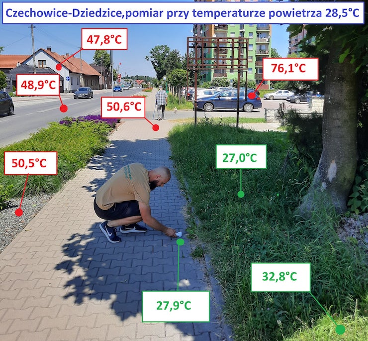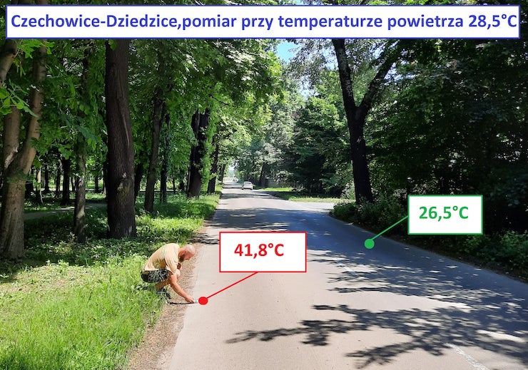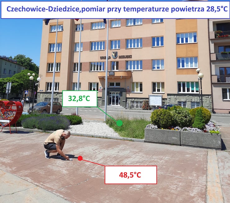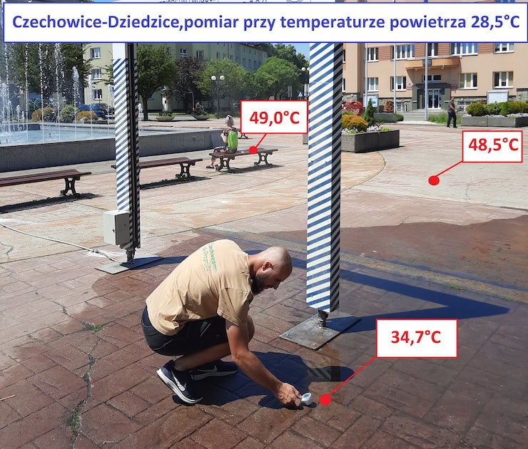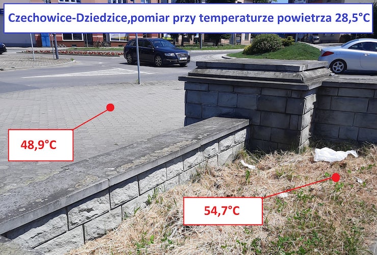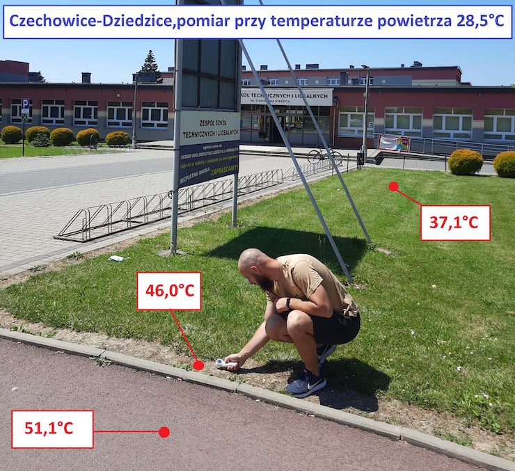 19 червня Міколай Семашко і Роберт Печарко з групи «Чеховчани за природу» виміряли температуру поверхонь в різних локаціях міста Чеховіце-Дзедзіце, що неподалік від Кракова і Катовіце. У той день температура повітря становила 28,5 градусів. Виміри вони почали проводити об 11:30 й застосовували термометр Braun BNT400.