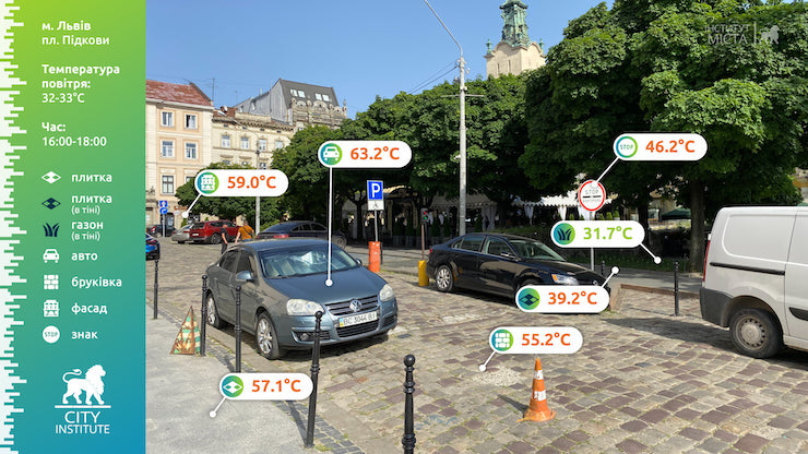 24 червня температура повітря у Львові сягала 32-33 градуси. У цей день із 16:00 до 18:00 «Інститут міста» виміряв температуру різних поверхонь у центрі міста.