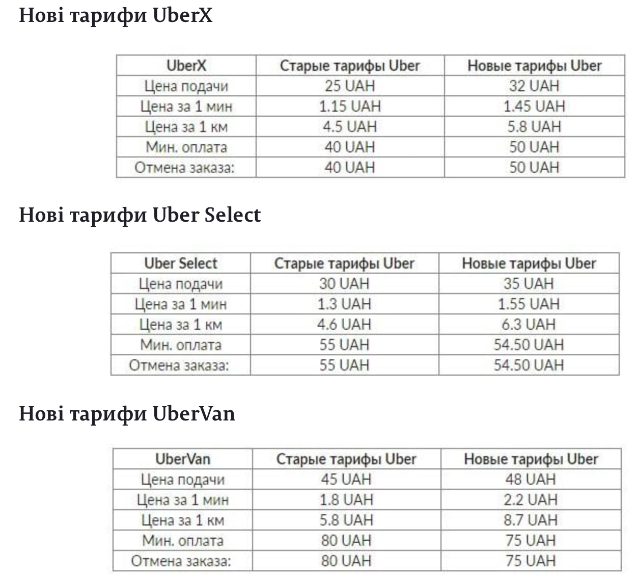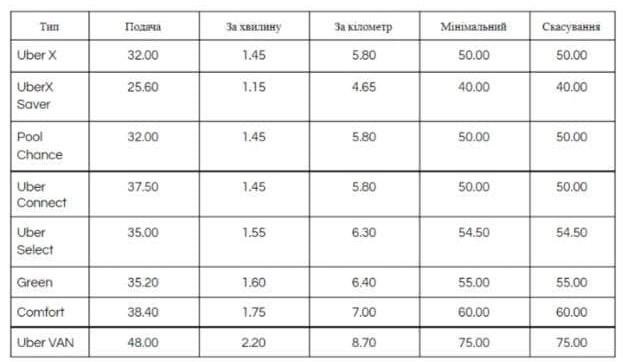 Судячи з таблиці, ціна за кілометр зросте приблизно на 20-25%. Тариф за кілометр поїздки в містких автомобілях Uber Van здорожчає на 33%.