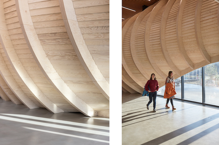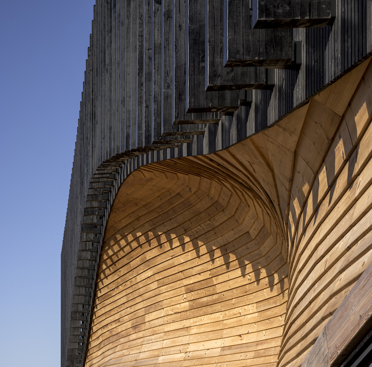Темні дерев’яні панелі, якими облицьовано другий рівень будівлі, ефектно контрастують зі світлою хвилеподібною нішею. Загалом у будівництві використали дерево, сталь і бетон. Ці панелі також захищають приміщення від прямих сонячних променів. До речі, подібний прийом використали Dmytro Aranchii Architects у проєкті заправки на київських Позняках.