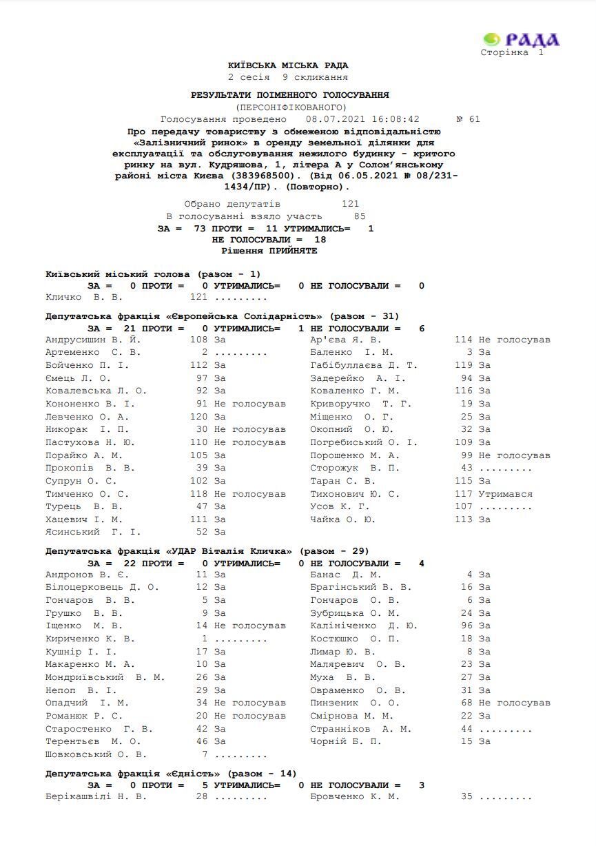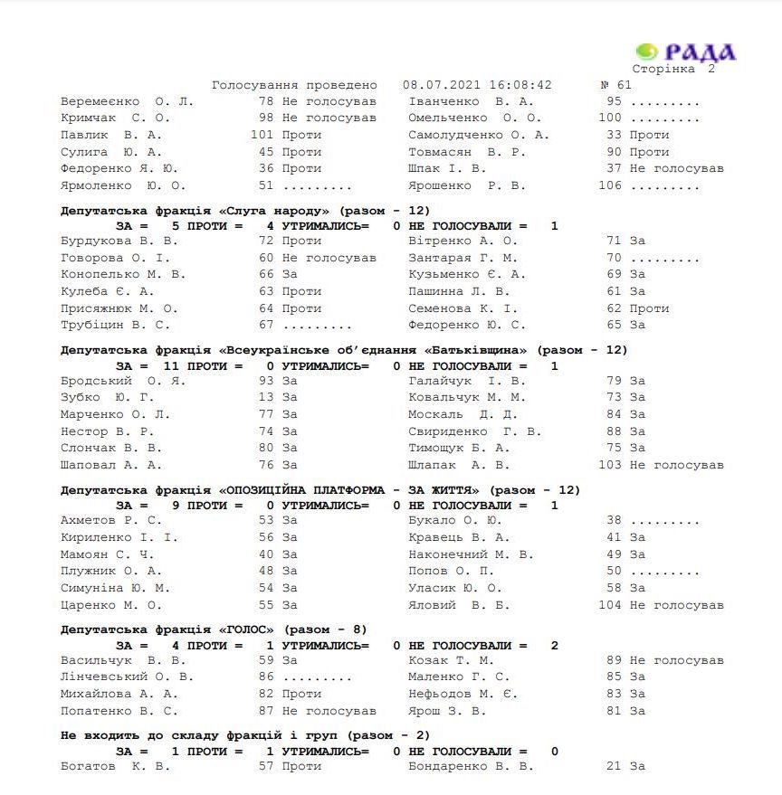 Як видно з поіменного голосування, за проголосували фракції Європейська солідарність, УДАР Віталія Кличка, Батьківщина та ОПЗЖ.