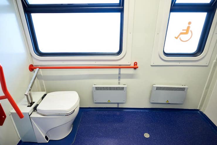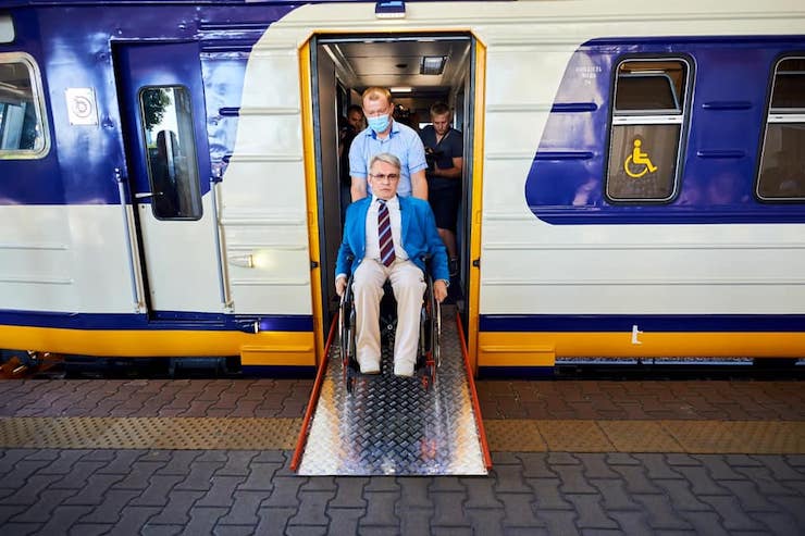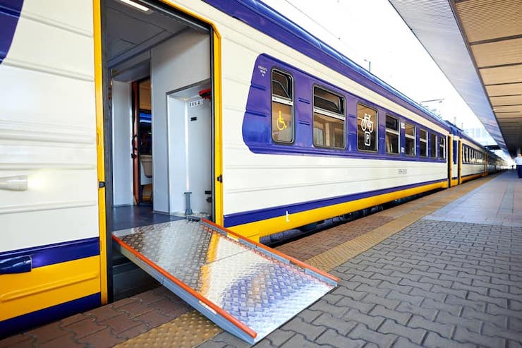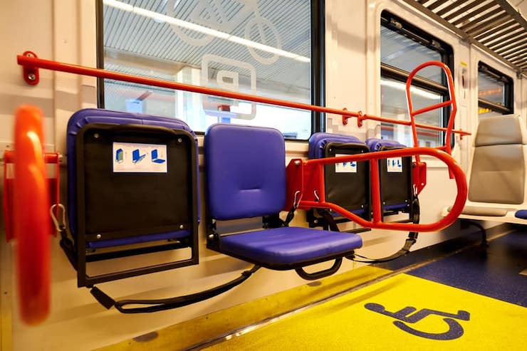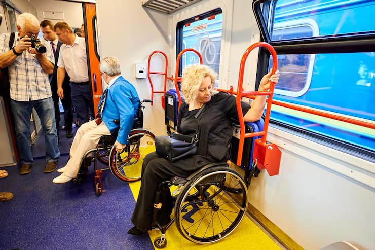 У вагонах є місця для людей на інвалідних візках, пандуси, кнопки виклику поїздної бригади, а всі вказівники нанесені шрифтом Брайля.