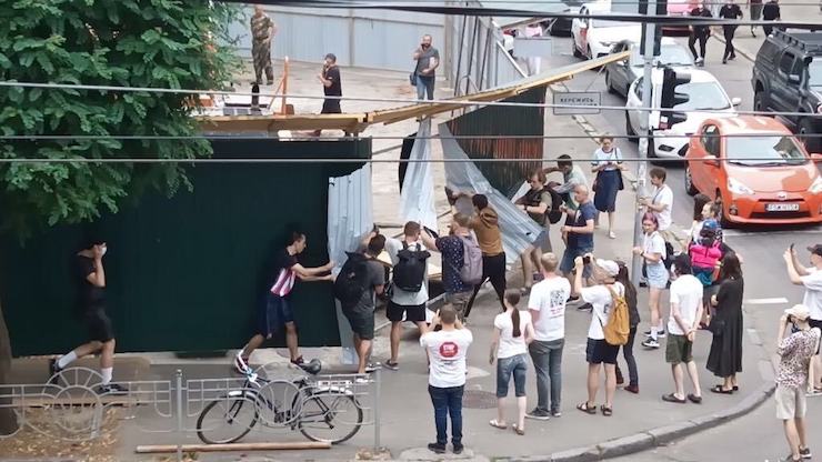 Кияни зламали паркан біля будівлі «Квіти України», яку почав зносити забудовник (фото)