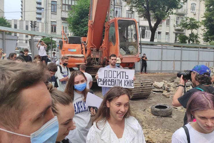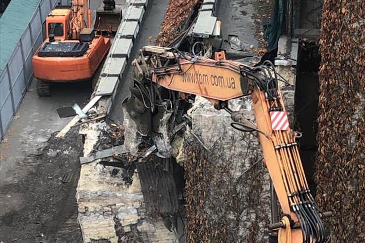 Забудовник вже зніс частину фасаду будівлі «Квіти України» на вулиці Січових Стрільців. Група киян зламала будівельний паркан і блокує техніку, повідомляє фейсбук-спільнота «Зберегти квіти України», яка веде пряму трансляцію.