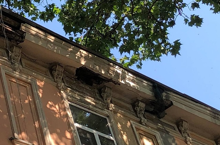 Містяни повідомили кореспонденту порталу «Усі», що зверталися до комунальної служби з проханням обрізати гілки дерева, які тиснули на дах будівлі. Цього своєчасно не зробили, тому обвалилася ділянка карниза довжиною майже 20 метрів, і він продовжує руйнуватися.